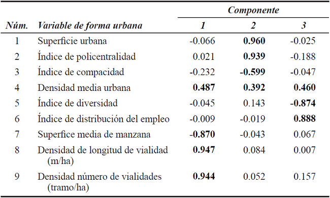 Al igual que los otros dos, el factor 3 es, de acuerdo con el ACP, independiente; es decir, que la “morfología local de la traza urbana” (factor 1) y la “estructuración global” (factor 2), además de ser independientes entre ellos, son independientes de la “diferenciación espacial de la actividad urbana” de las ciudades (factor 3).