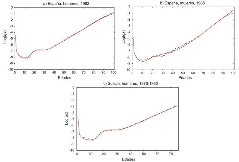 Las ecuaciones anteriores muestran una diferencia en el tercer sumando. Como lo mencionan Heligman y Pollard (1980), ambas formas presentan un mejor ajuste en la joroba de accidentes y en edades avanzadas. En este trabajo se utiliza la respectiva expresión, en función de lo que fue elegido en cada una de las fuentes bibliográficas seleccionadas y consultadas para este fin. Algunos ejemplos de las curvas estimadas con sus valores observados de qx , en escala de logaritmo natural, se muestran en la Gráfica 1.