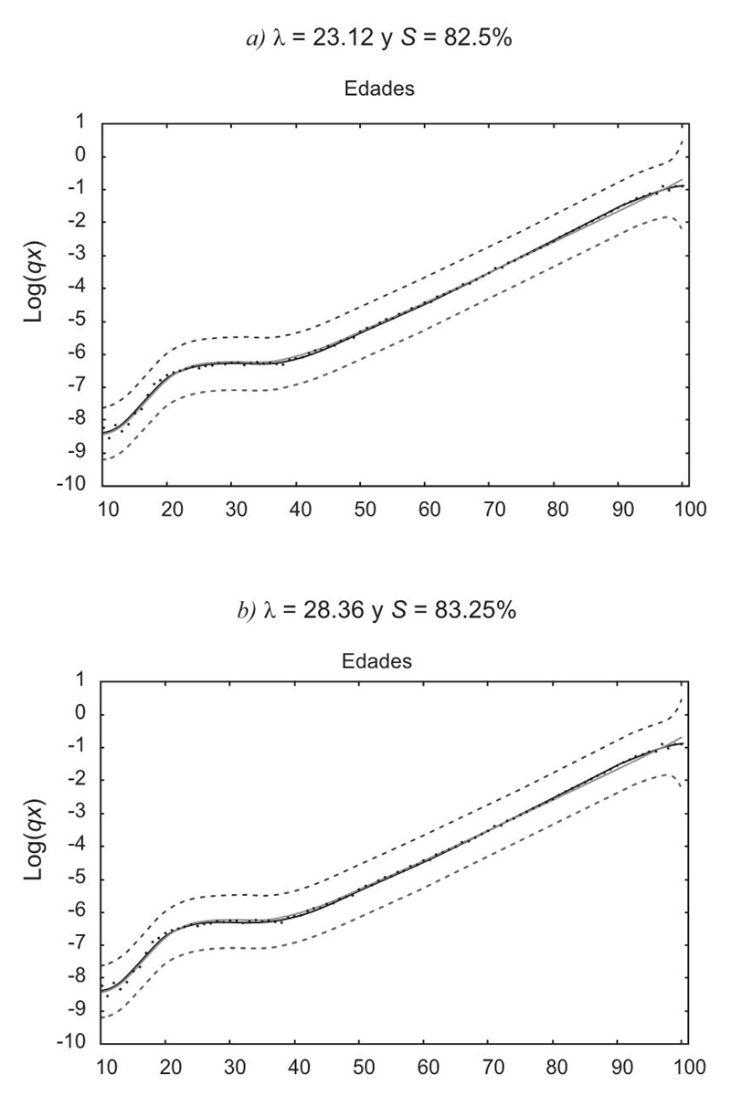 Los resultados son más convincentes cuando se omite de las estimaciones la mortalidad infantil y para menores de 12 años. Ahora se puede afirmar un rango adecuado de índices de suavidades para obtener curvas de mortalidad similares a aquellas que se obtendrían con la aplicación del modelo HP. En cada uno de los casos se encontró un valor de λ que aproxima lo suficientemente bien las estimaciones del modelo HP y además se proporciona un intervalo de dicha estimación.