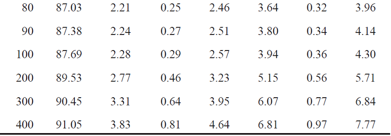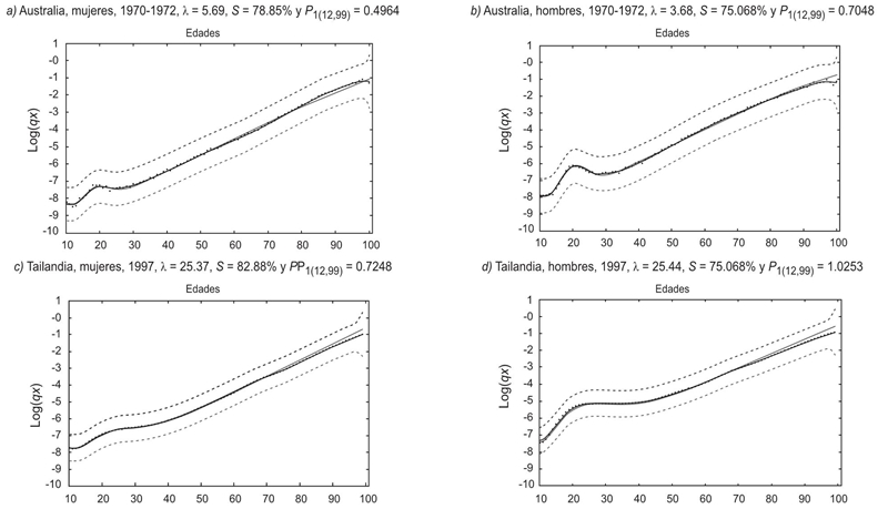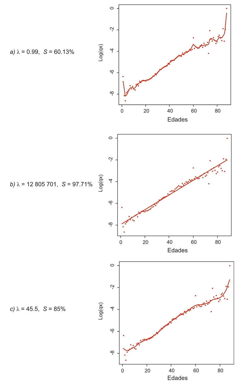 Los porcentajes de suavidad dependen claramente de la cantidad de datos. Por ejemplo, para el rango de edades de 12-99 años, ellos están entre S = 85.26% y S = 89.29%, y S = 75% y S = 87.71% para mujeres y hombres, respectivamente. Es posible encontrar casos en los cuales los valores de las funciones de pérdida sean altos con respecto a lo que se espera, lo cual sugiere que no hay un valor de λ que se aproxime lo suficiente a la tendencia estimada con la curva de mortalidad objetivo.