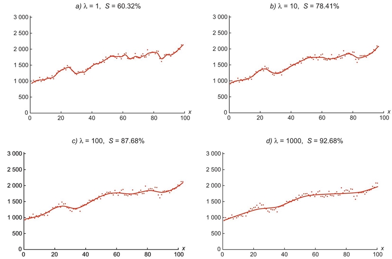 donde λ es el parámetro que penaliza la ausencia de suavidad. El primer término tiene como propósito el ajuste de la tendencia con los datos observados, en tanto que el segundo a la inducción de la suavidad. Puede apreciarse que cuando