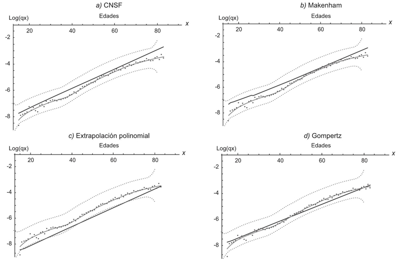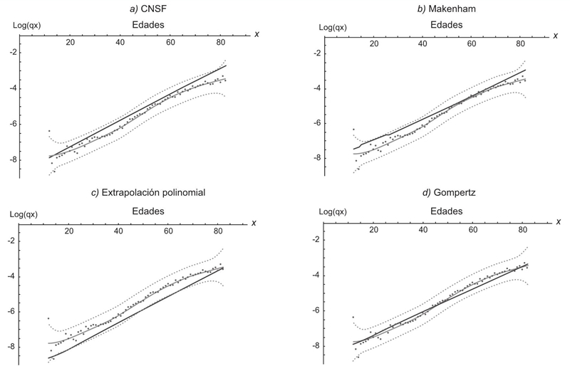 En esta sección se contrastan resultados desde la perspectiva aquí propuesta con algunas curvas de mortalidad obtenidas en Vargas (2014) y comparables con aquellos estimados por medio de índices de suavidades impuestas del S = 85% y S = 90%, respectivamente. En todos los casos se utiliza el logaritmo natural de las qx y sin pérdida de generalidad se ilustra con una población selecta; la lógica de la ilustración sería la misma para cualquier otra población que cuente con estimaciones de curvas de mortalidad. Se eligen los que ahí se refieren como tablas de mortalidad mexicana ajustada mediante el modelo de: a) CNSF, b) Makeham, c) extrapolación polinomial, y d) Gompertz. En particular, el modelo HP empleado no resultó ser comparable pues en casi todas las edades se tiene una estimación constante hasta casi los 75 años (véase Vargas, 2014, p. 88). Debe tenerse presente que cada estimación hecha de a a d, así como las de otros modelos de mortalidad, tienen una complejidad superior a lo que sencillamente se realiza con la estimación y/o medición de tendencias y suavidades respectivamente, pues tienen el común denominador de emplear criterios matemáticos de optimización lineal o no lineal con sus respectivos valores iniciales.