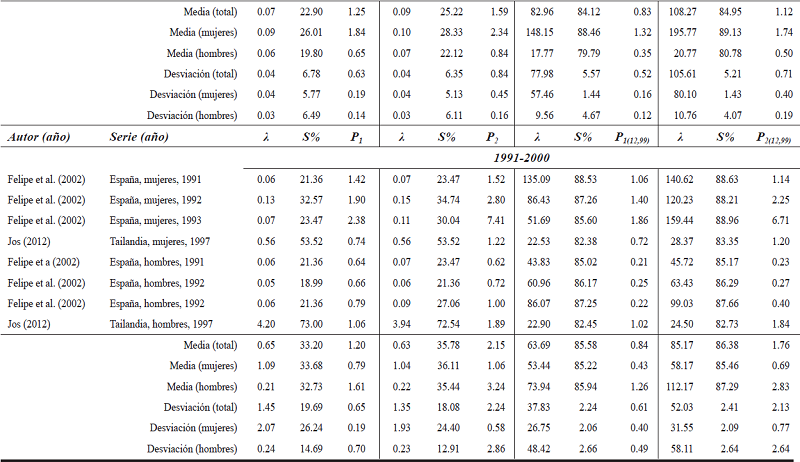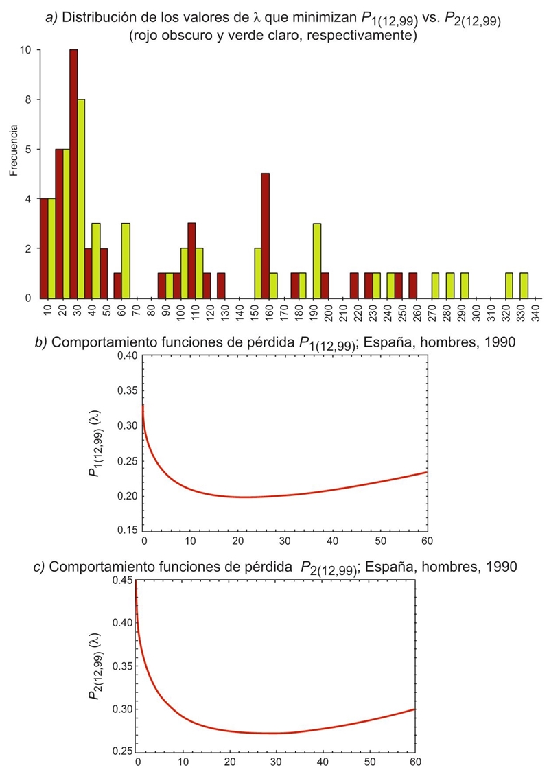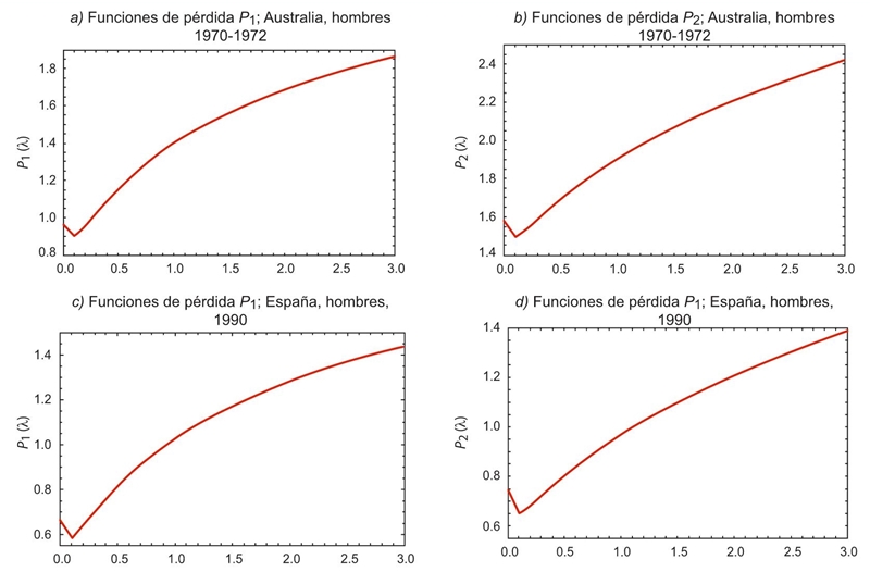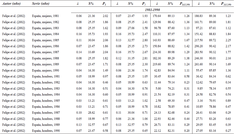 Se encontró que el valor de la función de pérdida para las series de Felipe, Guillen y Pérez-Marín (2002) de hombres es bajo, comparado con el de las mujeres, lo cual se puede observar en el Cuadro 1. Aunque se resolvió el problema del mal ajuste para los primeros datos de la serie, no se puede observar un patrón de distribución que siga los valores de λ. Es evidente que los resultados sugieren que el estudio de la suavidad inducida a través del modelo HP es perfectible para abarcar toda la experiencia de mortalidad.