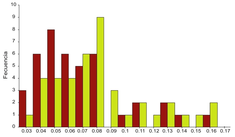 Al realizar este procedimiento de análisis para todas las series mencionadas, se tienen los siguientes resultados, mostrados en los histogramas de la Gráfica 7. La descriptiva de los mismos, así como los demás hallazgos, aparecen más adelante en el Cuadro 2. En ambos casos se aprecia una asimetría a la derecha, con una cola pesada.