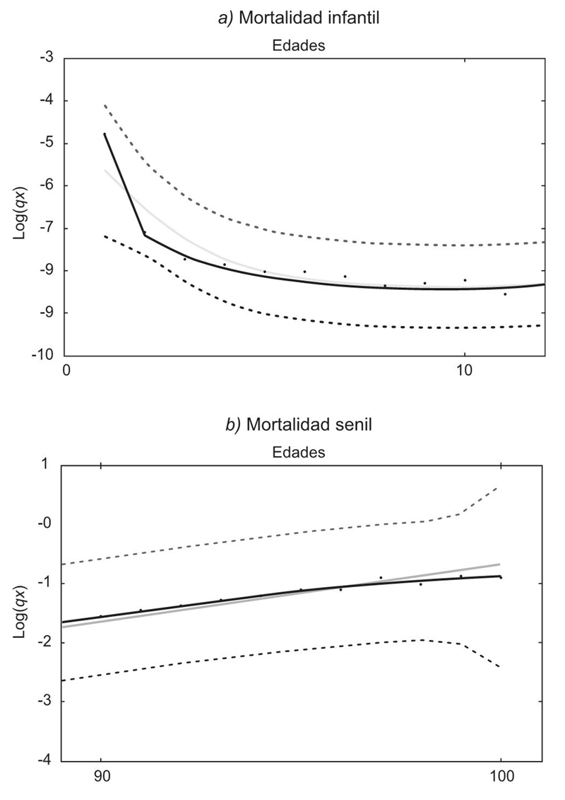 Una futura línea de investigación justamente consiste en realizar la aproximación no paramétrica a través de tres segmentos, por medio de la propuesta de Guerrero y Silva (2015), con lo que se podría replicar y adecuar el procedimiento aquí señalado, pero para cada una de las tres etapas de la vida, a saber: mortalidad infantil, mortalidad en edades jóvenes-adultas y mortalidad senil. Se considera que bajo dicha óptica se podría superar la limitante de la estimación que se manifiesta para la primera etapa de la vida.