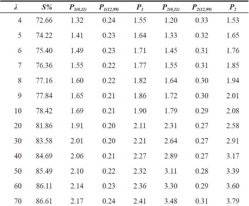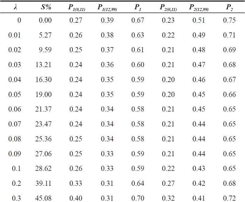 Se puede observar cómo para valores pequeños del parámetro de suavizamiento λ, entre 0.03 y 0.5, P1(0,11) alcanza su mínimo y se incrementa rápidamente cuando λ crece, mientras P1(12,99) alcanza su mínimo para valores entre 4 y 20, pero el total de P1 es fuertemente influenciado por el crecimiento rápido de P1(0,11). Un escenario similar ocurre en la función de pérdida P2. De hecho, también se aprecia cómo el valor P2(0,11) para valores entre 8 y 20 es considerablemente mayor que P2(12,99), donde su mínimo se encuentra de modo aproximado. Se debe recalcar que P2(0,11) contiene solamente 12 de los 100 datos, mientras P2(12,99) el resto. La presente situación se manifiesta análogamente en las demás series analizadas en el documento.