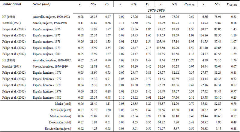 Se detectó homogeneidad en los resultados si se agrupan las estimaciones por décadas. De hecho, en muchos casos el índice de suavidad requiere ser más alto para el caso de las mujeres que para el de los hombres. Así pues, se tienen dos conclusiones sustantivas: cuando sólo se tiene una serie con tendencia lineal ascendente, es decir, cuando se omite la mortalidad infantil y de menores de 12 años, el índice de suavidad es alto, en tanto que cuando hay una tendencia no lineal en un segmento y otra tendencia lineal en el otro, es decir, cuando se toman todas las edades, entonces el índice de suavidad es más bajo.