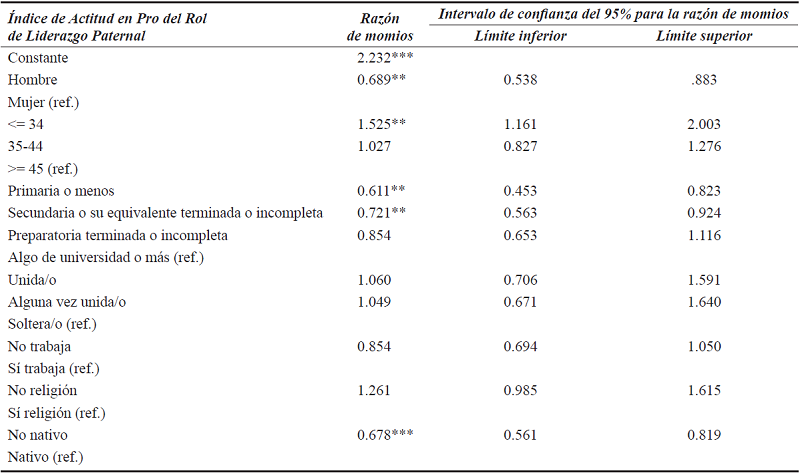Los resultados antes presentados dan cuenta del comportamiento diferencial de las actitudes de los padres y las madres acerca de la igualdad de género en los roles y liderazgos familiares, según sus características sociales y demográficas. Esto es importante, pero no es suficiente para el conocimiento sobre el comportamiento de este aspecto de la vida familiar y su probable influencia en el proceso de socialización de los menores de edad en los hogares familiares de México. Con el interés de acercarnos un poco más en este sentido, a continuación se presentan los resultados obtenidos en el análisis estadístico basado en los modelos de regresión multivariada que se realizaron para examinar la asociación que existe entre dichas características y los cuatro índices considerados.