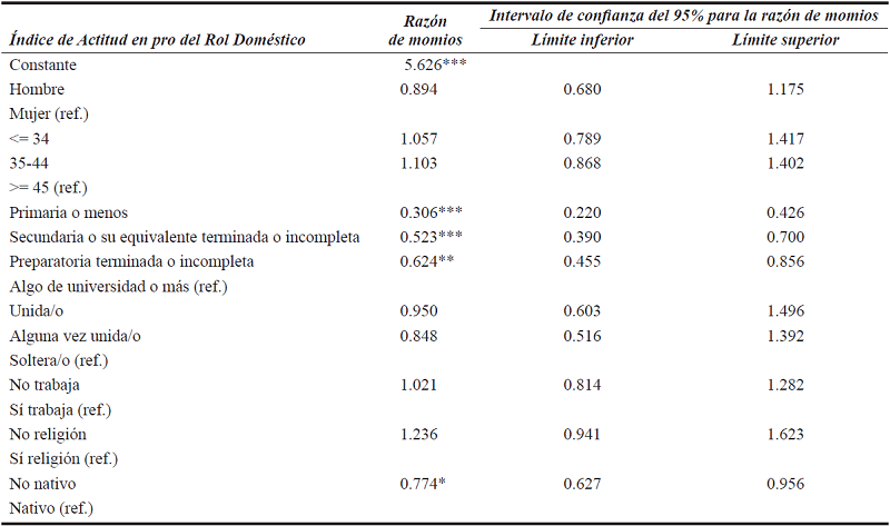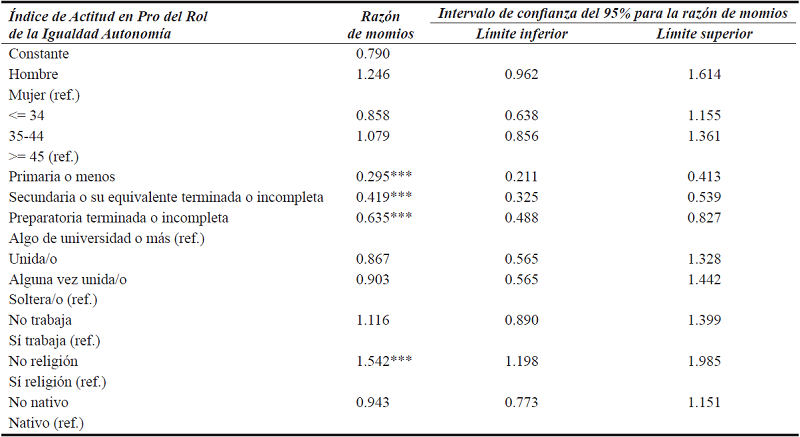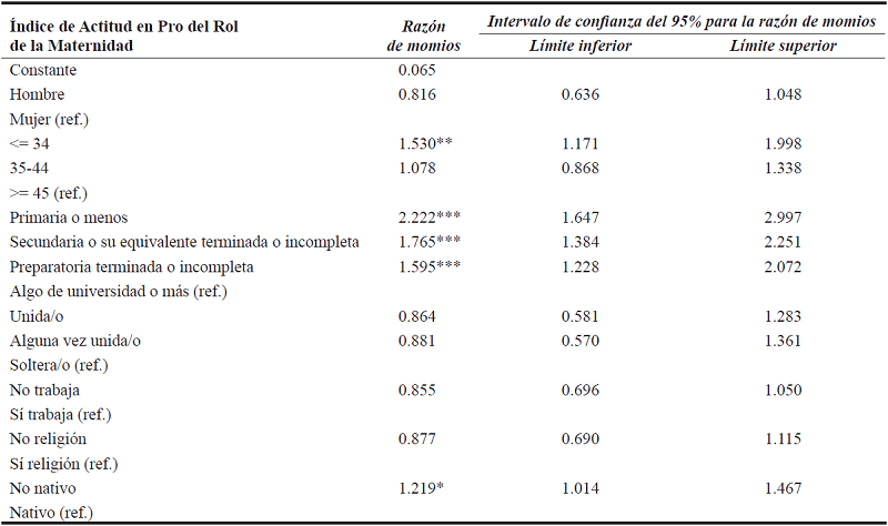 Concretamente, el ser un padre o una madre menor de 35 años de edad se asocia a una actitud 53% más a favor de la valoración suprema de la maternidad en la vida de la mujer, con respecto a la categoría de referencia que es ser un padre o una madre de familia con 45 y más años de edad. Por su parte, la escolaridad muestra diferencias estadísticamente significativas en todas sus categorías, dado que los coeficientes indican que a menor grado de escolaridad, mayor actitud en pro de la valoración de la maternidad. Así, entre los padres o madres que cuentan con estudios de preparatoria, la actitud se incrementa en 59% respecto de la categoría de referencia que es tener al menos algo de estudios universitarios; en tanto que entre aquellos con sólo educación secundaria se incrementa en 76.5%, y entre los que sólo tienen “primaria o menos” la actitud a favor de la valoración de la maternidad se incrementa más del doble. Esto implica que a mayor educación, menor es la actitud en pro de la valoración de la maternidad como valor supremo en la vida de la mujer. Finalmente, el ser padre o madre migrante se asocia con una mayor actitud en favor de la valoración de la maternidad en un 22% más de probabilidad con respecto de los padres y las madres nativos de Baja California.
