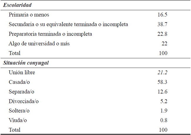 Por otro lado, se trata de una población que predominantemente tiene afiliación religiosa al representar el 83.4% de los casos. Sobre su situación conyugal, la mayoría tiene una relación de pareja, ya sea unidos en matrimonio (57.8%) o bien viviendo en unión libre (20.8%). Sin embargo, nótese que una proporción nada despreciable de ellos declaró haber estado anteriormente en una unión conyugal que, en el momento de la encuesta, estaba disuelta mayoritariamente por separación (12.6) o bien por divorcio (5.2), formando ambas categorías el 17.8% del total de padres de ambos sexos; mientras que sólo una minoría declaró ser soltera o soltero (1.9), situación que interesantemente va en contra de la errónea idea compartida de manera frecuente entre el personal administrativo de las escuelas de que un “gran número de niños en las escuelas tienen madres solteras”.2