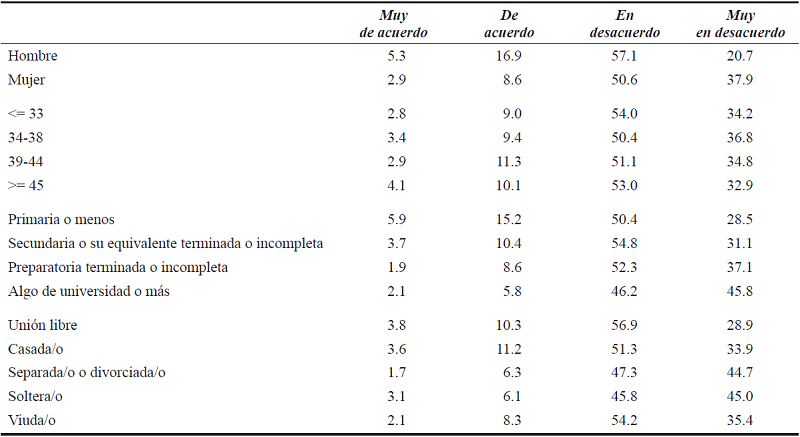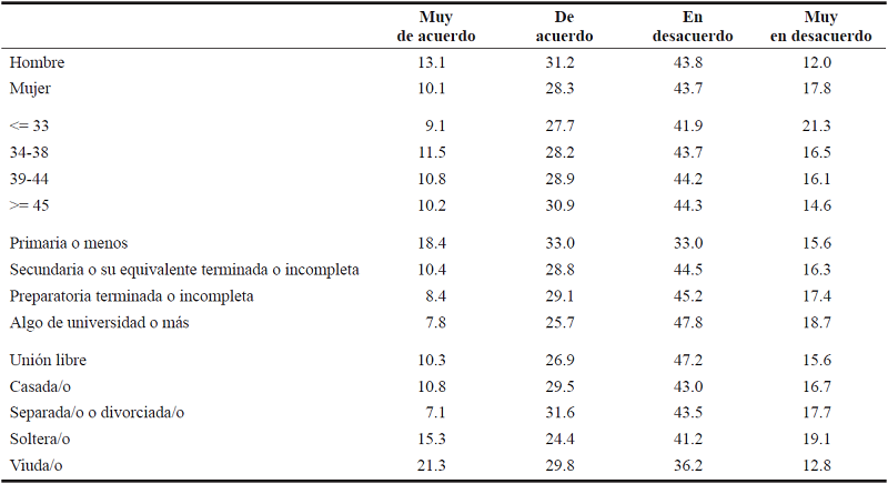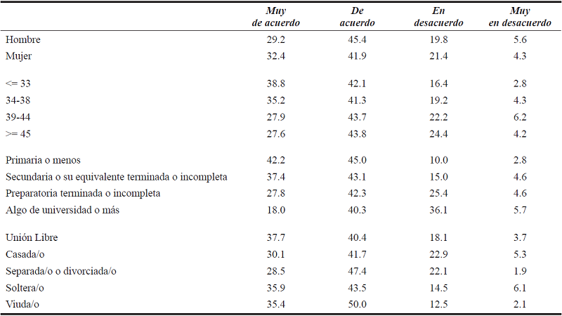 Por otra parte, en el Cuadro 3 puede verse un marcado apoyo por parte de los padres de ambos sexos en favor de la independencia económica de las mujeres, dado que el 83.2% de ellos declaró estar en contra del enunciado “para las mujeres tener un marido que las mantenga es más importante que trabajar”. Este alto porcentaje expresa un rechazo al conservadurismo familiar, específicamente en lo que se refiere a romper con la tradicional idea de que tener un marido es más importante que la independencia económica de la mujer. El alto nivel de desacuerdo con tal idea indica un cambio práctico a favor del trabajo en las vidas de las mujeres y por ende de su independencia económica en lo general y del marido en particular. El rechazo a esta idea es nuevamente más acentuado entre las madres que entre los padres, se presenta en prácticamente todos los grupos de edad, guarda una relación inversa con el nivel educativo, y es más notable entre las y los unidos conyugalmente, así como entre los viudos y las viudas.