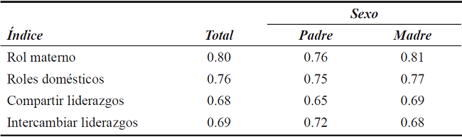 Partiendo de los hallazgos anteriores, se consideró importante analizar cómo se reflejan los relativamente altos niveles de acuerdo, arriba descritos, en favor de la igualdad de género entre los padres y madres entrevistados, pero en esta ocasión en aspectos más concretos relacionados con los roles y liderazgos familiares. Esto se refiere específicamente a: 1) la valoración del rol materno en la vida de la mujer, 2) la división sexual del trabajo doméstico y, 3) la posibilidad de compartir entre los sexos los liderazgos familiares (instrumental versus expresivo); así como 4) la posibilidad de que los padres, según su sexo, puedan elegir intercambiar dichos liderazgos. Para este propósito se recurrió a la medición de los niveles de apertura en favor de la igualdad de género contenidos en las actitudes de los padres en cada caso, mediante el cálculo de los cuatro índices respectivos. Nótese que el valor máximo posible en cada índice es de 1.0, que indica una apertura altamente entusiasta en favor de la igualdad de género, con excepción del índice referido al rol materno. En este último caso, debido a la construcción del índice, el valor máximo posible de 1.0 significa exactamente lo contrario; o sea un nivel mínimo de apertura a favor de la igualdad de género.