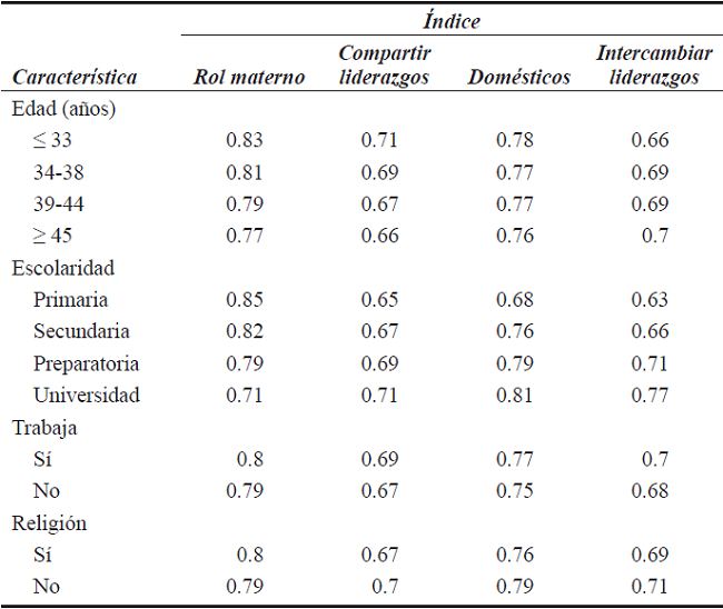 Cada uno de los índices se analizan en su conjunto y considerando por separado las características sociodemográficas de los padres de ambos sexos. En general, de manera sistemática se observa un comportamiento diferencial de los cuatro índices según algunas características, más que otras. El sexo de los padres es al parecer especialmente importante ya que imprime claras diferencias en los niveles de acuerdo y desacuerdo con la igualdad de género en los roles y liderazgos familiares. Como puede verse en el Cuadro 5, de los cuatro índices considerados destaca el valor más alto (0.80) que se le otorga al índice de la valoración de la maternidad en la vida de la mujer. Esta alta valoración es compartida tanto por los padres como por las madres, aunque ellas exhiben un mayor apoyo por tener un índice poco más alto (0.81) que ellos (0.76). Esta situación indica la prevalencia del gran valor social asignado a la maternidad en la vida de las mujeres mexicanas entre los padres y las madres con hijos en edades de educación secundaria.