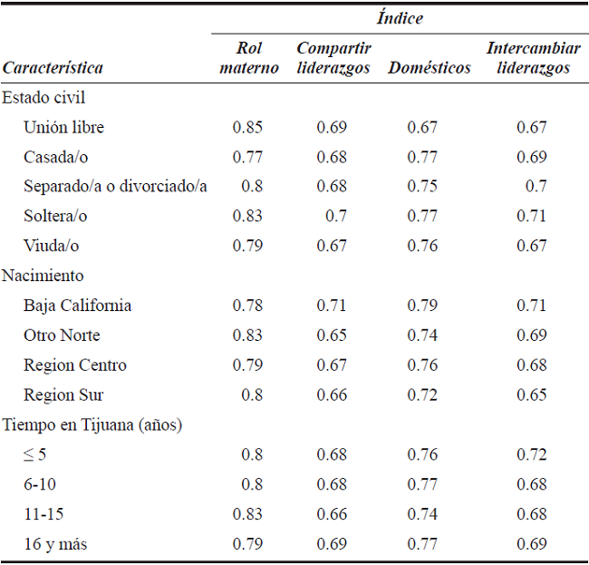 Finalmente, los inmigrantes con menos de 16 años de residir en Tijuana presentan valores más altos en el índice, por ser quienes asignan la valoración más alta al rol de la maternidad.