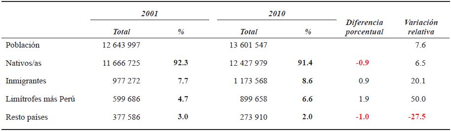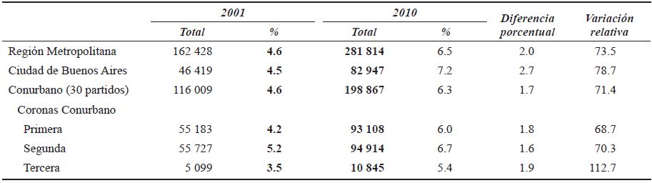 En principio, cabe decir que la participación de los migrantes en el conjunto de la población de la RMBA hacia fines de 2010 continuó siendo relativamente baja tanto a nivel personas (8.6%) como a nivel hogares (11.4%). No obstante, debe destacarse que, en términos relativos, a nivel personas durante el decenio la población extranjera creció en 20%, mientras que la población nativa en 6%, ganando así la primera una mayor participación en el conjunto. A nivel hogares se registró un crecimiento en términos relativos del 15%; sin embargo, este incremento resultó menor respecto al de los hogares nativos (22%). En consecuencia, en términos de participación la población extranjera, a escala hogares, se mantuvo estable durante el periodo. Por consiguiente, la hipótesis de la ocurrencia de un crecimiento extraordinario de los flujos migratorios externos producto de una inusitada expansión económica debe descartarse. Ahora, si bien no se detectó un comportamiento extraordinario de los migrantes externos en relación con el conjunto de la población, no ocurrió lo mismo en el interior de la población inmigrante de la RMBA.