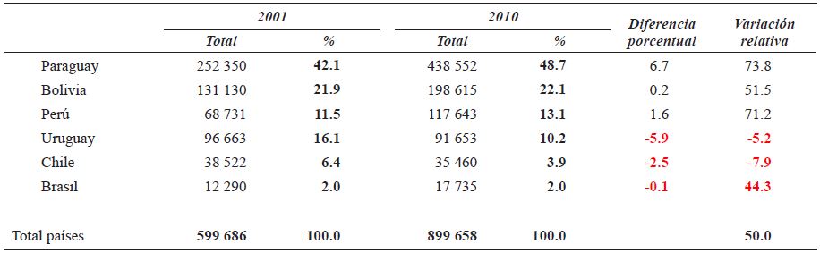 Si se observa el crecimiento neto de la población14 de inmigrantes de países limítrofes y Perú en la RMBA, 61% correspondió a Paraguay, 21% a Bolivia y 16% a Perú. Asimismo, cabe destacar que durante el periodo se produjo una contracción de la población de Chile y Uruguay. Ahora bien, este movimiento debiera matizarse puesto que el stock de población se mantuvo relativamente estable; no obstante, dada la expansión que se produjo en los inmigrantes de Paraguay, Bolivia y Perú en RMBA, estos grupos -como contrapartida- perdieron peso en el conjunto. En efecto, en términos de participación, en 2001 los uruguayos ocupaban el tercer puesto y en 2010 pasaron a ocupar el cuarto, y en su lugar se ubicaron los inmigrantes peruanos (Cuadro 2).