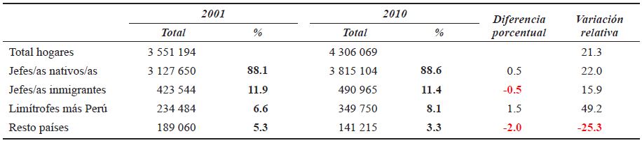 Si se analiza el comportamiento demográfico en la RMBA de los hogares, se advierte que durante el periodo se produjo un importante crecimiento en el que se pasó de 3.5 millones de hogares en 2001 a 4.3 millones de hogares aproximadamente en 2010 (que representó una variación relativa de 21.3%). La composición de los hogares según la procedencia del jefe (país de nacimiento) no muestra cambios significativos: los hogares con jefes nacidos en el extranjero representaban el 11.9% del total en 2001 y el 11.4% en 2010 (Cuadro 3).