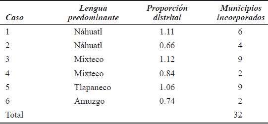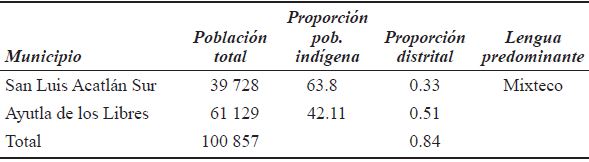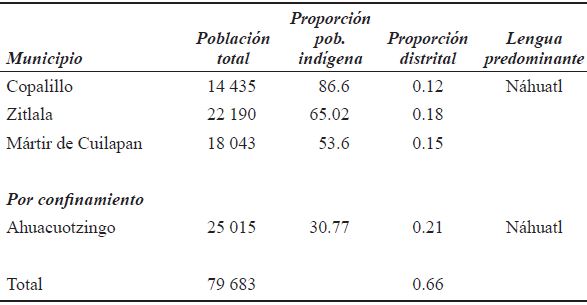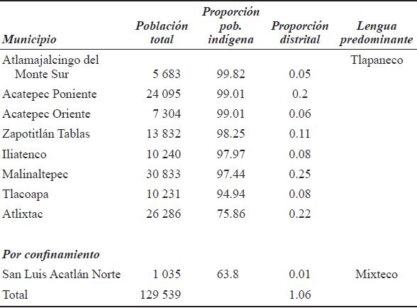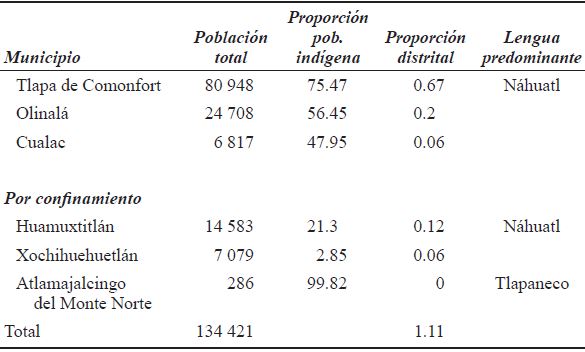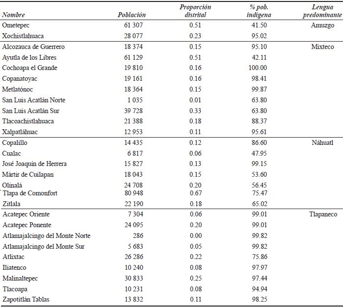 El estado de Guerrero cuenta con 27 municipios con más de 40% de población indígena; sus lenguas predominantes son: amuzgo, mixteco, náhuatl y tlapaneco. De estos municipios, seis que tienen como lengua predominante el náhuatl son contiguos: Mártir de Cuilapan con 0.15, Zitlala con 0.18, Copalillo con 0.12, Olinalá con 0.2, Cualac con 0.06 y Tlapa de Comonfort con 0.67 de proporción distrital. José Joaquín de Herrera, con 0.13 de proporción distrital, en el que también predominan los hablantes de náhuatl, no forma parte de la contigüidad, por lo que no se incluye en el grupo. La suma de la población de los seis municipios equivale a 1.38 distritos electorales, lo que excede el rango máximo de población; otro aspecto a considerar es que confina los municipios no indígenas de Xochihuehuetlán, Huamuxtitlán, Alpoyeca y Tlalixtaquilla de Maldonado (Mapa 3).