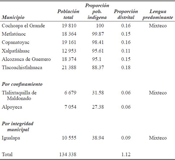 De esta manera, se agrupan los municipios contiguos de Cochoapa el Grande, Metlatónoc, Copanatoyac, Xalpatláhuac, Alcozauca de Guerrero y Tlacoachistlahuaca; debido al confinamiento en la parte norte también se añaden Tlalixtaquilla de Maldonado y Alpoyeca, que tienen como lengua predominante el mixteco y no cuentan con la proporción de población establecida para considerarse como indígenas. Además, también será incluido Igualapa, ya que cuenta con una fracción de sección discontinua en el interior de Metlatónoc, y con su incorporación se preserva el criterio de continuidad geográfica. La suma de los nueve municipios suma una proporción distrital de 1.12, por lo que conformará un distrito electoral (Cuadro 4 y Mapa 5).
