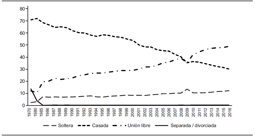 Mediante el análisis de la serie histórica de las estadísticas de natalidad por tipo de situación conyugal de las mujeres (1985 a 2016) del Instituto Nacional de Estadística y Geografía (INEGI),1 se observan algunas tendencias importantes (véase la Gráfica 1). Por ejemplo, tomando como referencia 1985, se tenía que 7.25% de los nacimientos los concentraban solteras, 68.99% casadas (por lo civil o religioso), 19.71% en unión libre y 0.18% divorciadas o separadas. Para el año 2016, 12.37% de los nacimientos ocurren cuando la mujer es soltera, 30.38% se relacionan con mujeres casadas, pero 49.25% ocurren cuando las mujeres se encuentran en unión libre. Un total de 0.35% de nacimientos se verifican en mujeres que están separadas o divorciadas.