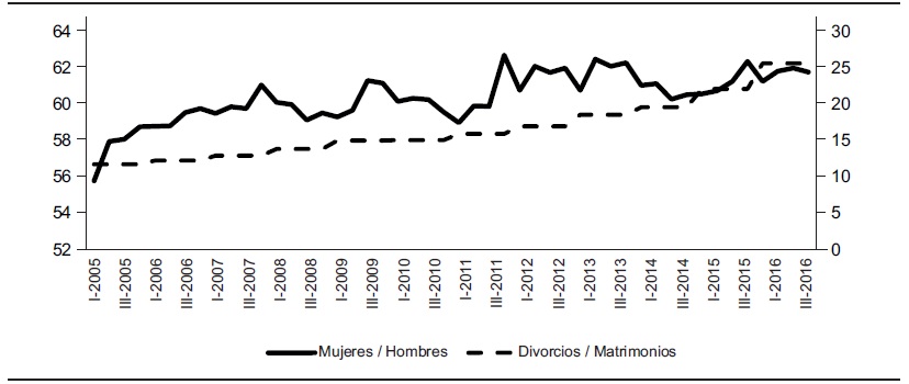Los datos indican que, a medida que transcurre el tiempo (de 2005 a 2016), hay una mayor participación de las mujeres en el mercado laboral mexicano. Por ejemplo, en el primer trimestre de 2005 se tenían casi 56 mujeres por cada 100 hombres, y en el cuarto trimestre se llega a 62 mujeres por cada 100 hombres. También se observa que la cantidad de divorcios en relación con el total de matrimonios aumenta, pues en 2005 se tuvieron 11.78 divorcios por cada 100 matrimonios, mientras que en 2016 la cifra llega a casi 26 divorcios. Por lo tanto, la entrada de más mujeres al mercado laboral mexicano ha sido suficiente para poder incidir en la cantidad de divorcios y matrimonios. Esto no implica que sea la única variable que explica el aumento en los divorcios y la caída en los matrimonios.