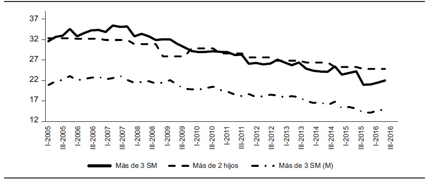 Finalmente (y no menos preocupante), cada vez son menos los mexicanos y mexicanas de 2005 a 2016 que ganan más de tres SM. Lo anterior prueba la validez del modelo Calidad-Cantidad para el caso mexicano: ante la disminución de ingresos, se tienen menos hijos.