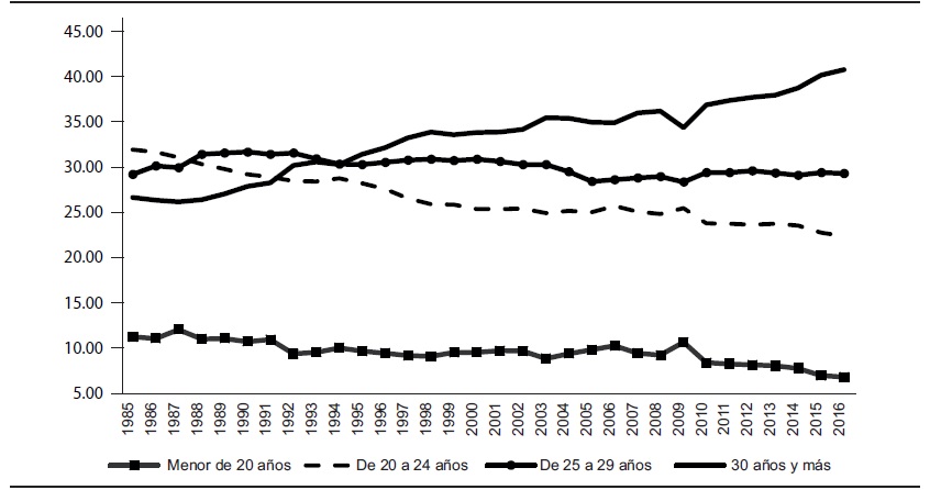 En la Gráfica 4 se presentan estas ideas en relación con el contexto mexicano. Se muestran series de 1985 a 2016 sobre el porcentaje de nacimientos registrados por año de acuerdo con la edad de la madre para el caso de madres que trabajan. Los datos permiten identificar que inicialmente (1985) el mayor porcentaje de nacimientos ocurre en las madres de 20 a 24 años (31.92%). Para 1988 cambia la tendencia y el mayor porcentaje ocurre en aquellas de 25 a 29 años (31.41%). Nuevamente, en 1995 se genera otro cambio, ya que la serie que concentra el mayor porcentaje (31.42%) es la que identifica nacimientos donde la madre reporta 30 años y más. A partir de esta fecha se observa una tendencia positiva en esta serie, lo cual implica que en 2016 el 40.75% de los nacimientos en México se verifican con mujeres que trabajan y son mayores de 30 años. Como referencia, en 1985 esta condición sólo se verificaba en el 26.63% de todos los nacimientos registrados. La serie de nacimientos donde la madre trabaja y tiene de 20 a 24 años experimenta una tendencia a disminuir con el tiempo. La serie de nacimientos con mujeres que trabajan y tienen de 25 a 29 años se ha mantenido entre el 6 y el 11% a lo largo del tiempo, sin mostrar una tendencia marcada, ya sea positiva o negativa. Finalmente, la serie que indica nacimientos en mujeres que trabajan y tienen menos de 20 años se mantuvo constante hasta 2010. A partir de esta fecha presenta una tendencia negativa.