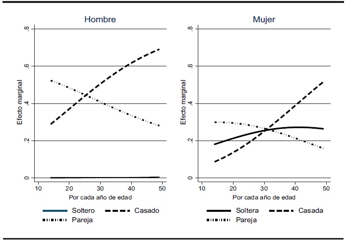 Para el caso de los hogares administrados por hombres, se observan efectos muy similares a los de los hogares administrados por mujeres. Por lo tanto, en el caso de los datos de México se aprecia que un incremento en la edad de las personas favorece el establecimiento de hogares tradicionales por encima de otro tipo de arreglos.
