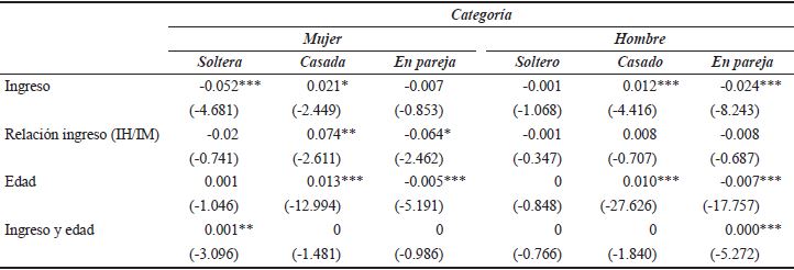 Dado que la categoría de referencia en la variable dependiente es un hogar administrado por una mujer (un hombre) soltera (soltero) sin hijos, lo que se observa como impacto marginal en cada uno de los parámetros es en realidad la razón de probabilidades (odd ratio) que favorece el cambio de una categoría a otra.