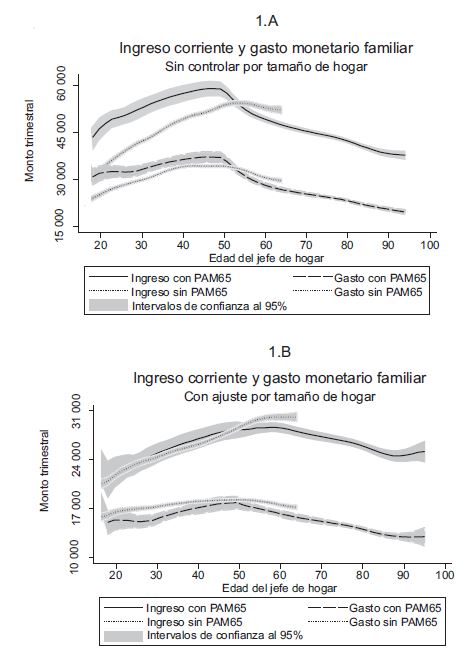 Si comparamos las medias de ingreso y gasto de los hogares de los Cuadros 1 y 2 con los resultados del modelo, se observa que después de controlar por la edad del jefe de familia y el tamaño de hogar, las diferencias en el ingreso entre hogares con y sin adultos mayores son inexistentes y las diferencias en el consumo en favor de los hogares sin personas adultas mayores tienden a desaparecer cuando los hogares se acercan a su flujo máximo de gasto, alrededor de los 50 años del jefe del hogar. De la observación de la Gráfica 1.B se desprende que la correlación entre ingreso y consumo es alta, confirmando los hallazgos de Campos y Meléndez (2013) sobre la no suavización del consumo y en contraste con las hipótesis teóricas del ingreso permanente y del ciclo de vida de Friedman (1957) y Modigliani (1986), respectivamente.