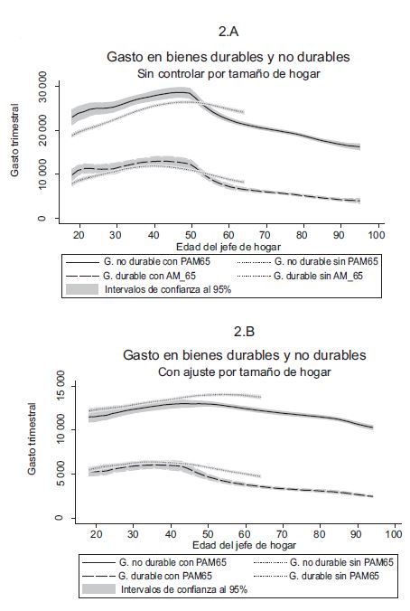 La Gráfica 2.A acerca de los componentes durable y no durable del gasto sin ajuste demográfico, y la Gráfica 2.B, con ajuste por tamaño de hogar, confirman y permiten profundizar sobre los hallazgos de la Gráfica 1. Después de ajustar los perfiles usando la escala de equivalencia de la OCDE, se identifica que el consumo de los hogares sin adultos mayores presenta un comportamiento más suave a lo largo del ciclo familiar. Específicamente, el descenso del consumo de los hogares con personas adultas mayores después de alcanzar el máximo flujo de gasto marca la diferencia; en particular, los hogares con adultos mayores tienen una mayor caída proporcional del consumo de bienes durables frente a los no durables.