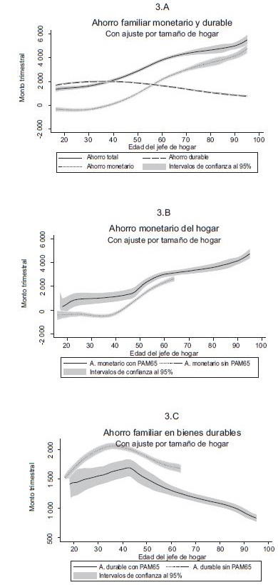 La Gráfica 3 muestra la estimación del modelo no paramétrico para los perfiles de ahorro por los componentes de ahorro monetario y de ahorro en bienes durables después de controlar por el tamaño del hogar. En la Gráfica 3.A se identifica claramente la tendencia creciente del ahorro total impulsada principalmente por el comportamiento empinado del ahorro monetario a lo largo de todo el curso de vida familiar, mientras el ahorro en bienes durables posee un comportamiento más plano y descendente después de los 40 años del jefe del hogar.