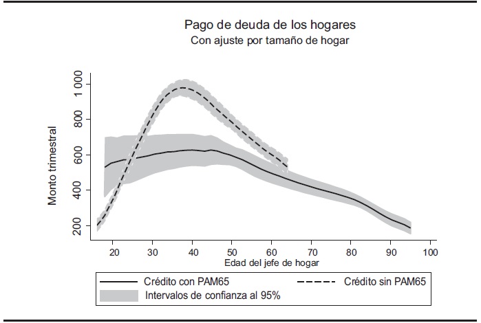 La Gráfica 4, acerca de los perfiles de pago de deuda de los hogares con y sin personas adultas mayores, muestra el comportamiento del crédito de los hogares a lo largo del curso de vida familiar. En general, hay clara evidencia de que los hogares sin personas en edad avanzada poseen mayores niveles de pago de deuda frente a aquellos con población adulta mayor, en un comportamiento muy parecido a los perfiles del gasto en bienes durables.