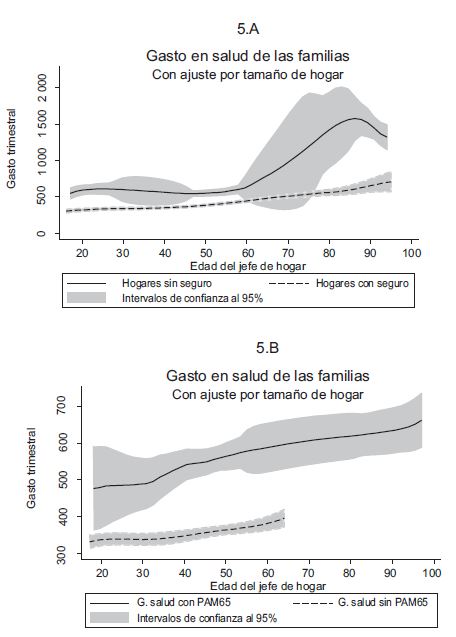 La Gráfica 5.A muestra que el gasto en salud de los hogares sin seguridad social no es sólo más alto, sino que presenta mayor varianza que el gasto de los hogares con seguridad social, incrementando el riesgo de incurrir en gastos familiares catastróficos (Knaul y Torres, 2003; OMS, 2000). Particularmente, a partir de los 60 años del jefe de familia, el gasto en salud de los hogares sin seguridad social toma una forma empinada y volátil, mostrando la alta correlación entre el gasto en salud de los hogares y la edad de sus miembros, así como la gran relevancia de la seguridad social en las fases avanzadas del curso de vida familiar. La Gráfica 5.B muestra que, una vez que se controla por escala de equivalencia, los hogares con presencia de personas adultas mayores de 65 años o más poseen significativamente mayor gasto en salud que los hogares sin la presencia de esta población. Asimismo, los perfiles de los hogares con personas en edad avanzada presentan mayor volatilidad del gasto, especialmente hacia los extremos del curso de vida familiar, donde el grosor del intervalo de confianza es mayor, configurando una forma parecida a un reloj de arena inclinado.