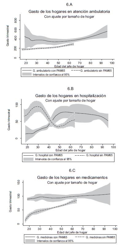 Los resultados del modelo sugieren que los efectos más importantes de la presencia de la población de adultos mayores se observan en el aumento de alrededor de 50% del gasto en salud y 43% de incremento de su varianza; las diferencias de este gasto son menores al inicio del ciclo familiar, pero divergen con el aumento de la edad del jefe de familia. Asimismo, se observa que en los hogares con personas adultas mayores existe mayor nivel de ahorro monetario a lo largo de todo el ciclo de vida familiar y menor flujo de pago de crédito. El incremento del gasto en salud de los hogares con personas adultas mayores es evidencia del proceso de envejecimiento de la población y de los problemas de salud que vienen con la edad. Los hogares enfrentan esta contingencia por medio del incremento del ahorro monetario a lo largo del curso de vida, mientras los servicios de seguridad social disminuyen la varianza de dicho pago en salud y los riesgos de incurrir en pagos catastróficos por gastos de bolsillo.
