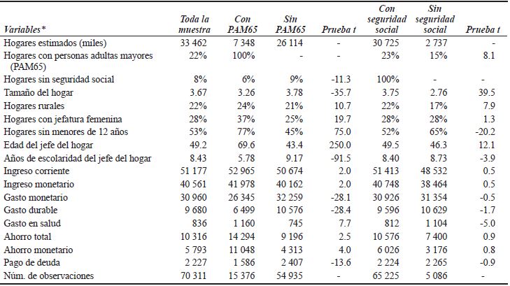En este apartado se describe el comportamiento de las variables de interés de la ENIGH-2016 en relación con el ámbito económico y de salud de los hogares con y sin personas adultas mayores de 65 años o más (PAM65), así como de las familias con y sin seguridad social.4 El Cuadro 1 muestra que en 2016 había más de 7 millones de hogares con presencia de al menos una persona adulta mayor (22% del total de hogares del país), mientras 8% de las familias no contaba con ningún tipo de servicio de seguridad social. Existen diferencias significativas en la estructura y el comportamiento sociodemográficos de los hogares con y sin adultos mayores, así como entre los que cuentan y los que carecen de seguridad social. Por ejemplo, los hogares con población adulta mayor tienen menor número de integrantes, son más rurales, con menos población menor de 12 años y con mayor proporción de jefaturas femeninas, resultados consistentes en general con las hipótesis de feminización y ruralización de la vejez en México.