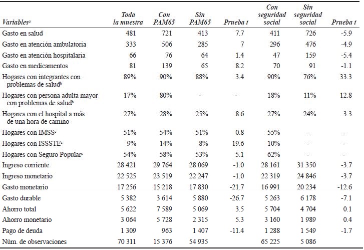 El Cuadro 2 presenta el resumen de las variables asociadas con los aspectos de salud en los hogares, tales como los problemas de salud de sus miembros, el gasto al respecto, sus componentes, la tenencia de seguridad social por tipo y las variables monetarias, pero esta vez en términos per cápita, ajustando por escala de equivalencia del hogar con la propuesta de la Organización para la Cooperación y el Desarrollo Económico (OCDE), en la que se divide el monto familiar entre la raíz cuadrada del tamaño del hogar correspondiente. De igual forma que se hizo en el Cuadro 1, se agrupan los estadísticos por hogares con y sin personas adultas mayores, así como con y sin seguridad social. En principio, se observa que la diferencia en el gasto en salud, a pesar del ajuste demográfico con la escala de equivalencia, se mantiene de manera tal que los hogares con población adulta mayor gastan 42% más que aquellas familias sin personas en edad avanzada; dicho comportamiento del gasto en salud es conducido especialmente por el gasto en atención ambulatoria y en medicamentos de los hogares con personas adultas mayores.