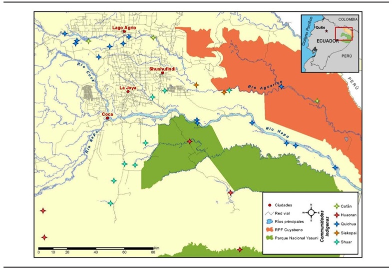 Los kichwas de la Amazonía Norte de Ecuador superan las 100 mil personas (Conaie, 2014). Este estudio trabajó con los kichwas situados a lo largo de los ríos Napo y Aguarico, en las áreas de las provincias de Napo, Orellana y Sucumbíos. Ésta es una de las etnias que más contacto ha tenido en los ámbitos social, político, cultural y económico. Con respecto al resto de la población, es la etnia que tiene más vinculaciones laborales con el Estado, pues los kichwas son contratados para trabajar con el resto de las etnias amazónicas como profesores, promotores de salud y capacitadores, entre otros empleos. Poseen un territorio de 2 684 000 ha aproximadas de ocupación y 1 115 000 adjudicadas. Tienen vinculación con áreas protegidas a través del Parque Nacional Sumaco Napo-Galeras.