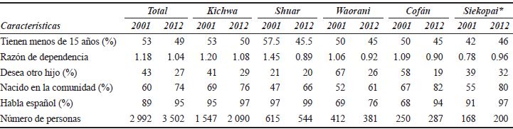 Demográficamente, estas poblaciones indígenas son jóvenes, pues la mitad o más de miembros tiene menos de 20 años, lo que refleja su alta fecundidad. Los kichwa y shuar tienen la fecundidad más alta, con una tasa global de fecundidad marital (TGFM) de 11.3 y 8.3 respectivamente, seguidos por los waorani (7.9) y los cofanes y siekopai (4.9). Estas poblaciones son esencialmente de fecundidad natural, con poco conocimiento y escaso uso de métodos modernos de regulación de la fecundidad: apenas 17% de todas estas poblaciones reporta el uso de métodos modernos y más del 70% indica que no desea tener hijos (Salinas y Bilsborrow, 2016). Existe una aceleración del crecimiento de la población por la reducción de la mortalidad, que declina principalmente por las exitosas campañas de vacunación por parte del Estado, mientras la fecundidad se mantiene alta.
