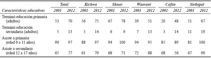 Por etnia, respecto a la culminación de la educación primaria por parte de los adultos, la cofán es la que más puntos subió, de 20% en 2001 a 48% en 2012. Respecto de la finalización de la educación secundaria para adultos, nuevamente esta etnia presenta la mayor alza, de sólo 3% en 2001 a 14% para 2012. Hay que anotar que, si bien los datos se presentan con tendencias a crecer en las cinco etnias, aún los niveles de educación seguían bastante bajos en comparación con la población total ecuatoriana (56% de los adultos entre los 20 y 24 años habían completado la educación secundaria, según los datos del censo de población de 2010). De las cinco etnias, la siekopai tiene el mayor porcentaje de personas adultas que habían culminado la educación secundaria, tanto en 2001 (11%) como en 2012 (19%), lo cual les fue facilitado por tener una escuela en la comunidad más grande.