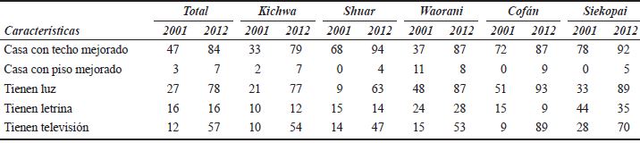 En todas las etnias se presenta un aparentemente amplio aumento en las condiciones de vida entre 2001 y 2012, que se refleja en primera instancia en las características de las viviendas. Las casas con techo mejorado (que cambiaron techos de palma a zinc) subieron de manera sustancial a nivel global, de 47% en 2001 a 84% para 2012 (Cuadro 3), siendo los kichwas y los waorani los que presentaron los cambios más significativos. En contraste, con respecto al piso mejorado, el cambio es mínimo porque de forma general subió solamente de 3 a 7%, o sea, casi todos seguían con pisos de tierra o tablones. Otro elemento relevante es que estas poblaciones incrementaron considerablemente su acceso a la luz eléctrica porque aumentó de 27 a 78%, con incrementos grandes en todas las etnias debido a las nuevas conexiones a lo largo de las carreteras de acceso o a los generadores comunitarios y los paneles solares.