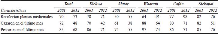 Sobre las actividades de subsistencia, específicamente la caza, las etnias cofanes y waorani presentaron la mayor orientación a esta actividad en el pasado, seguidos por los kichwas, luego los siekopai, y por último los shuar. Los waorani y los cofanes pueden presentar la mayor orientación porque se encuentran más alejados de los centros poblados y de los mercados, y tal vez por el acceso a la rica biodiversidad de las reservas en donde viven. Es interesante resaltar que esta clasificación tiene precisamente el orden inverso de las etnias en términos de sus niveles de participación en la economía de mercado, anotado en el párrafo anterior. Las actividades de caza y pesca son actividades no sólo de subsistencia, sino también de roles de género y generacional, por lo tanto, esenciales para su identidad cultural (Lu, Bilsborrow y Oña 2010; Lu y Bilsborrow, 2011).