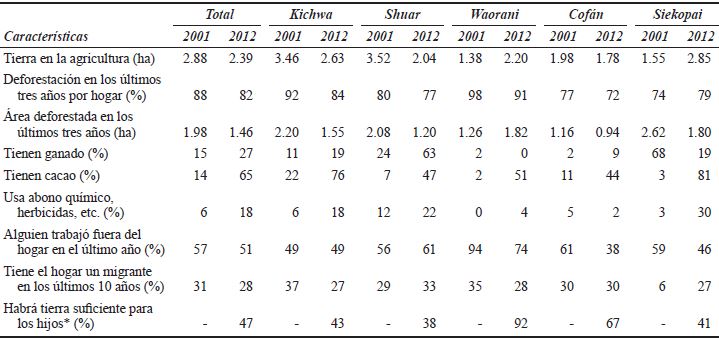 Para el primer año de estudio, 2001, el cacao no era un producto comercial sustancial, pero se volvió central para los años siguientes y así se mantiene hasta la actualidad. Globalmente se puede apreciar su aumento de forma considerable, de 14 a 65%; la tendencia indica que sus actividades agrícolas se están enfocando en el mercado porque no aumenta el uso de la tierra para la agricultura ni la deforestación, pero sí se incrementa el cultivo de cacao. Por lo tanto, se encuentran cambiando el uso de la tierra para estos productos comerciales y en el futuro pueden seguir ampliando la frontera agrícola, dado que las comunidades necesitan más recursos para la compra de más bienes y servicios (luz, salud, educación formal, alimentos procesados), por lo que mediante el cacao pueden acceder a recursos monetarios de forma continua durante todo el año. Por etnia, la que presenta los cambios más grandes son los siekopais (de 3 a 81%), seguidos por los kichwas (22 a 76%).