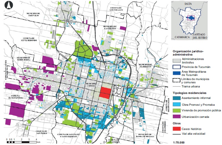 La distribución residencial presenta un claro patrón de concentración por tipo, según las tipologías identificadas: asentamientos informales, urbanizaciones cerradas y viviendas de promoción pública (Mapa 1). Los asentamientos informales se localizan siempre periféricamente en un arco sur-sureste, en concordancia con el suelo inundable al sur (por debajo de la cota del río Salí) y hacia ambos márgenes del río, al este. Las urbanizaciones cerradas se localizan en un arco pedemontano que se extiende al oeste y noroeste de la mancha, en contacto directo con la sierra de San Javier. La vivienda de promoción pública se ubica en el suelo periférico central, localizado principalmente hacia el norte y sur de la mancha urbana. Cabe destacar los casos de las acciones de mejoramiento barrial y de vivienda de zonas intersticiales del año 1972, que son periféricas a la mancha urbana, aunque a veces tienen una localización más central (Gómez López, Cuozzo y Boldrini, 2015).