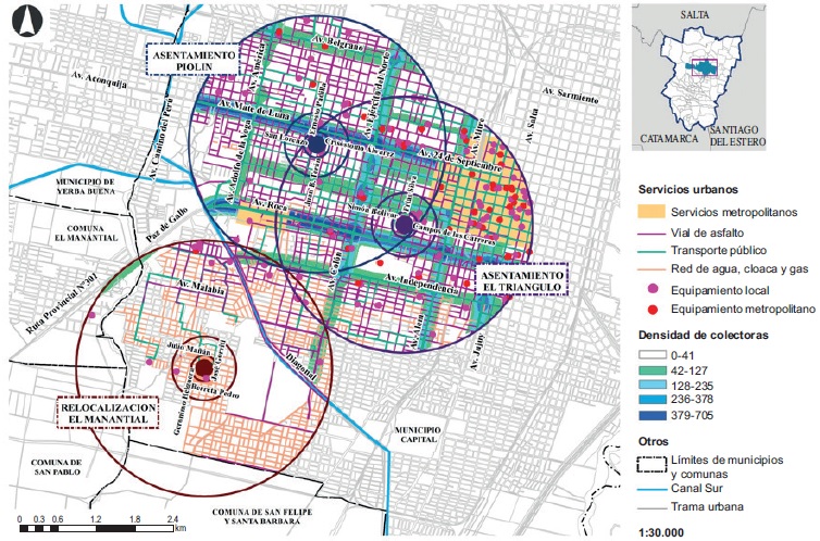 Respecto a la cobertura del transporte público, se observa que la oferta de servicios disminuye notablemente en la situación de relocalización. En el caso del Piolín, éste posee 16 colectoras con una distancia de 150 m la más cercana (avenida Mate de Luna); El Triángulo tiene 20 con una distancia de 170 m la más cercana (calle Lavalle); y Manantial III, con una distancia mínima de 2 200 m y por calle de ripio (ruta provincial 301), ya que las dos más próximas (avenidas Colón e Independencia) se encuentran inaccesibles por la presencia del canal, que constituye una barrera física insalvable sin obra civil mediante.
