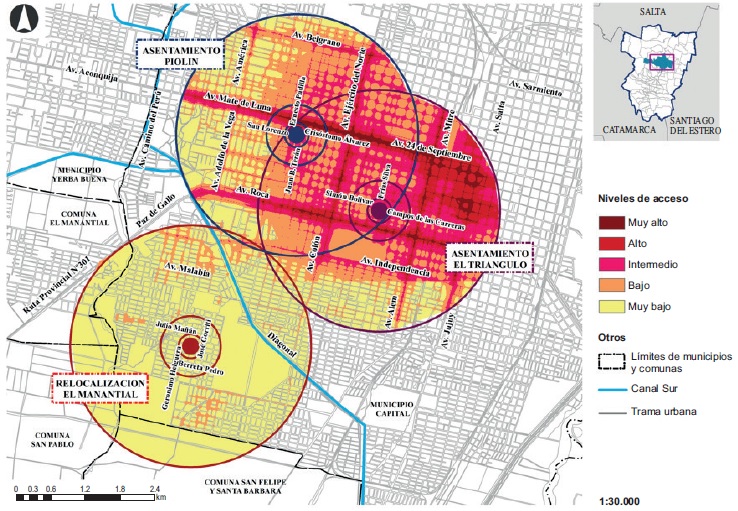 De esta manera, tanto Villa Piolín como El Triángulo se encuentran localizados en áreas donde la accesibilidad es muy alta, alta e intermedia; mientras que en Manantial Sur ésta disminuye a baja y muy baja (Mapa 3).