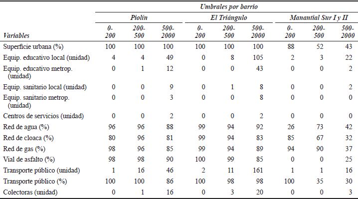 Las variables educación, salud, líneas de transporte público, colectoras y áreas con servicios metropolitanos se consideran desde su cobertura en términos unitarios. En el caso de las colectoras de transporte público, se considera la distancia mínima al barrio por la vía accesible.