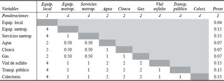 La estimación de las ponderaciones para cada variable que compone el análisis (Cuadro 2) resulta de una propuesta de las investigadoras, que tomaron la decisión de otorgar mayor peso a las variables transporte público, colectoras de transporte, vialidad de asfalto, equipamientos y centralidades metropolitanas, en tanto las mismas inciden en el flujo de personas que se movilizan hacia el resto de las localidades del AMeT. Se otorgó valor intermedio a las redes de agua, cloaca y gas por su necesidad de uso para el funcionamiento diario y la salubridad de los hogares; y la menor ponderación de peso fue la de los equipamientos locales (sin disminuir su incidencia en relación con las demás) en tanto polarizan a la población en un entorno menor.