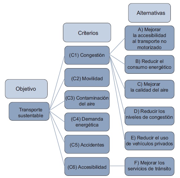 La evaluación del transporte resulta un tema complejo, ya que en algunos casos la información es escasa, incompleta o, a veces, nula. Una de las tendencias para evaluar al transporte es mediante una metodología multicriterio. Esta metodología posee ciertas ventajas al ser comparada con las herramientas de decisión unidimensionales en la medida en que hace posible considerar un número amplio de datos, relaciones, criterios y propósitos, los cuales se presentan dentro de un problema de decisión dado, que se estudia según un modelo multidimensional (Grajales-Quintero, Serrano-Moya y Hahn Von-H, 2013, p. 291).