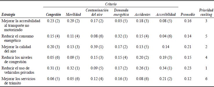 De esta forma, se estableció el orden de las prioridades o ponderación de las variables. En primer lugar, se encuentra el criterio de contaminación del aire; en segundo, el de movilidad; en tercero, de congestión; en cuarto, de demanda energética; en penúltimo lugar, el criterio de accesibilidad; y finalmente, el de accidentes.